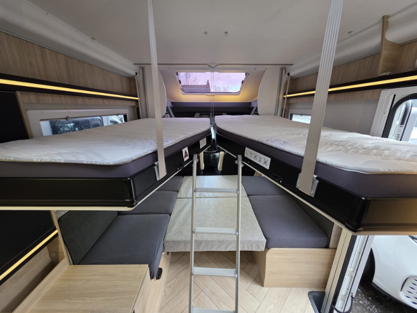 The Chausson 630 Etape is refreshingly different, utterly unique and delivering a practical, fun motorhome that will make you smile. With two Adult drop-down singles over the lounge enabling those who like to go to bed / get up at different times and a large lounge double, excellent mid-kitchen, and spacious rear garage. Prepare to be impressed!